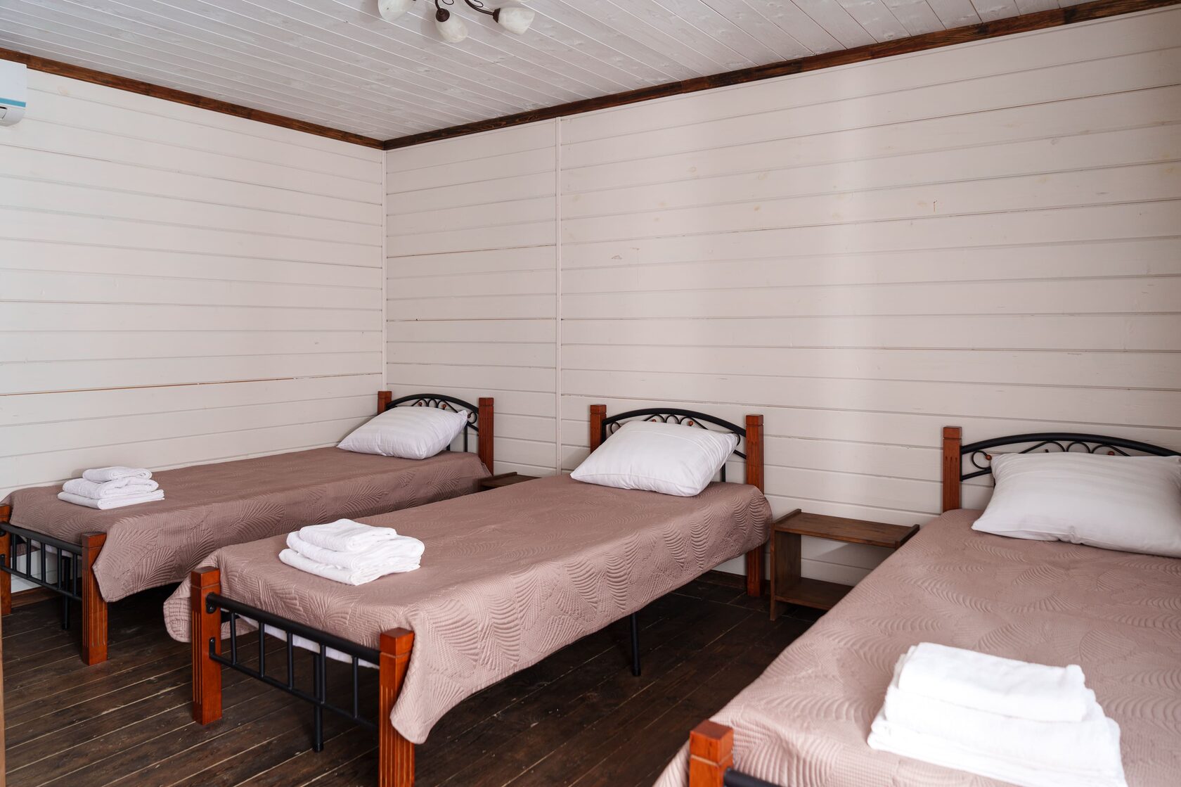 Небольшой, но очень уютный номер с тремя удобными кроватями, вместительным шкафом, телевизором, кондиционером, прикроватными тумбочками и комодом. В номере есть совмещенный санузел с душем, раковиной, унитазом, зеркалом, полочкой для банных принадлежностей и вешалкой для полотенец.