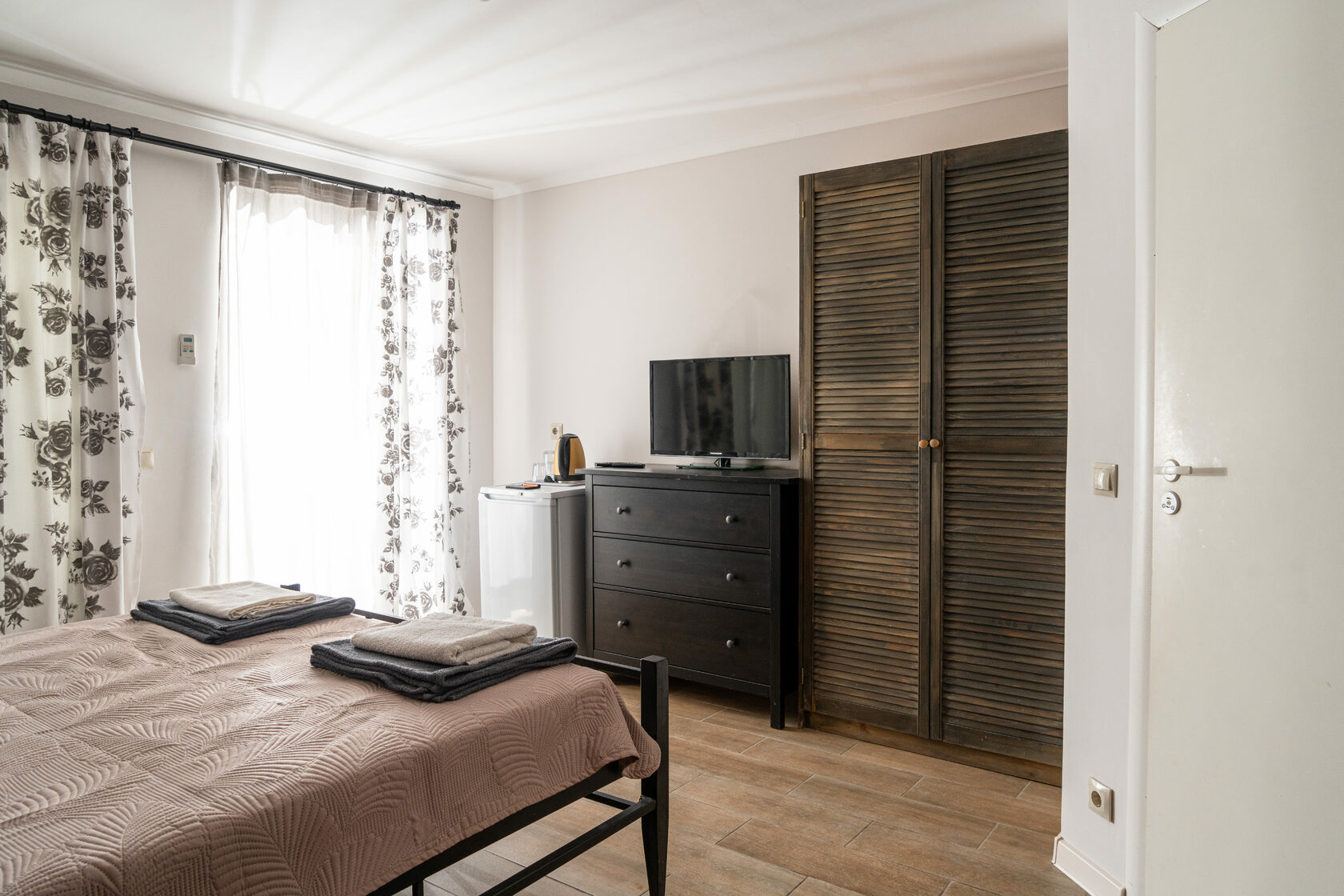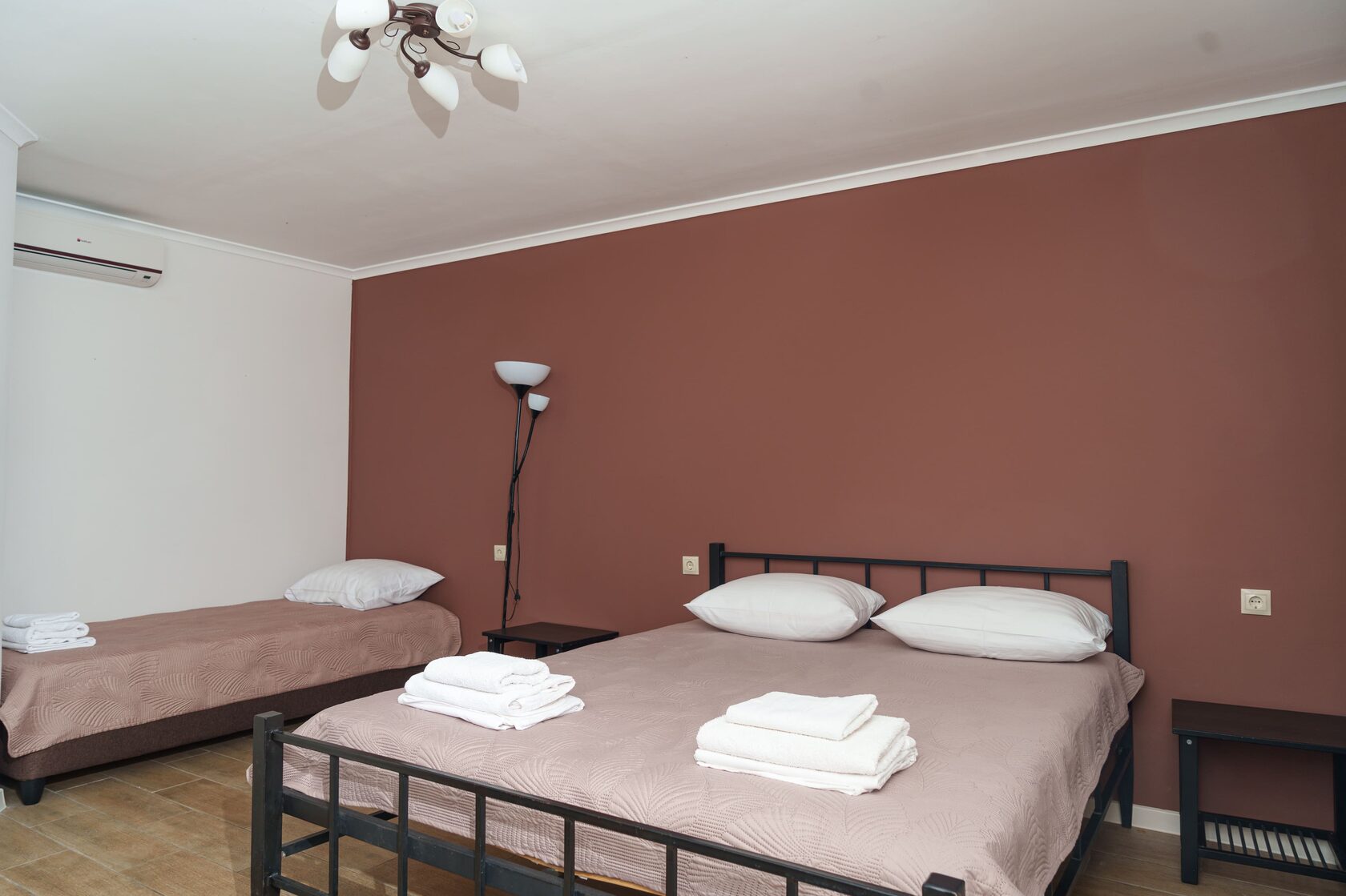 Один из самых популярных вариантов для семьи из трех человек. В номере есть две удобные кровати: двуспальная и односпальная, а также множество мест для хранения вещей, холодильник, телевизор и кондиционер. В совмещенном санузле есть душевая кабина, раковина, унитаз, зеркало, полочка для банных принадлежностей и вешалка для полотенец.