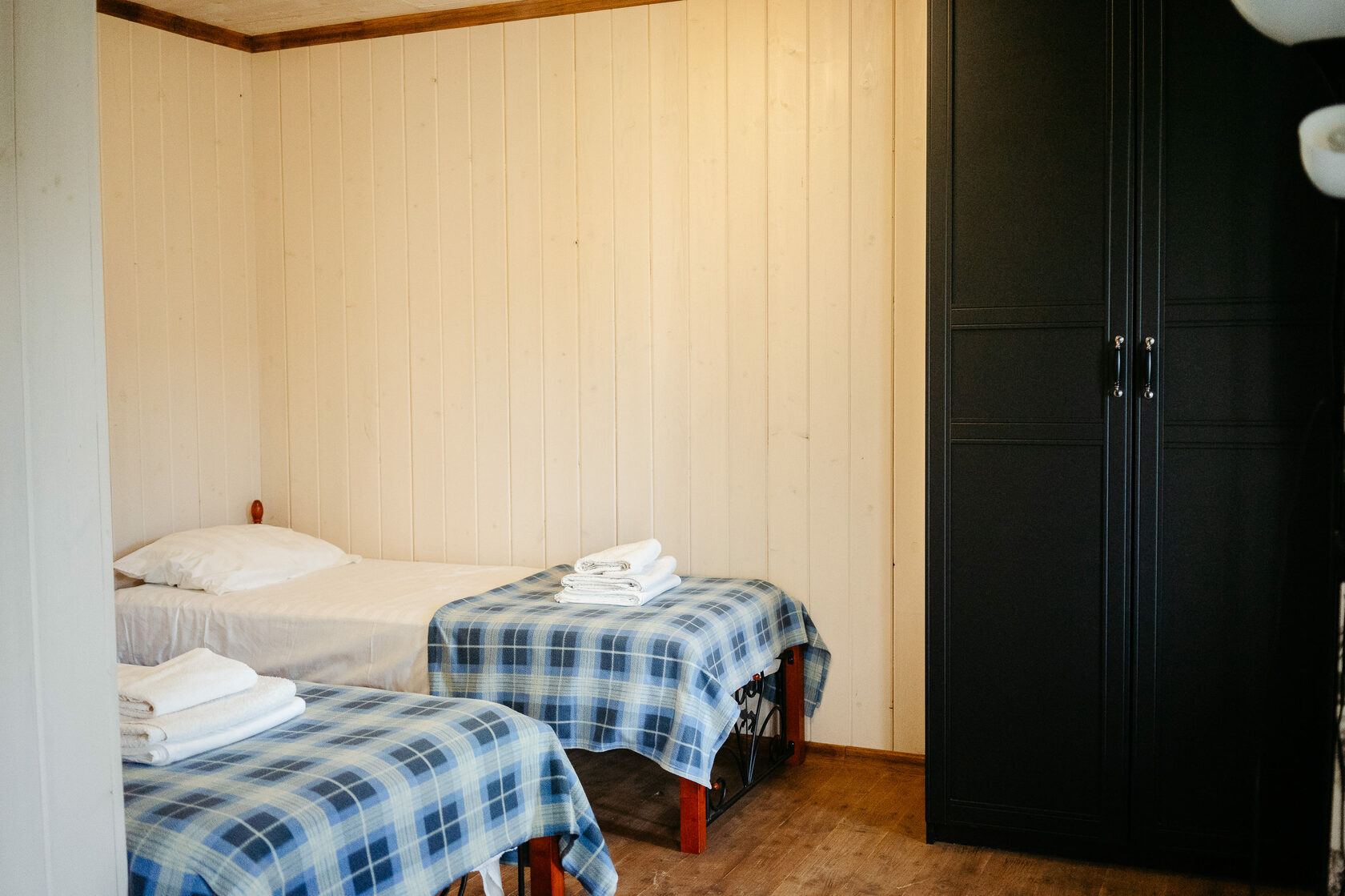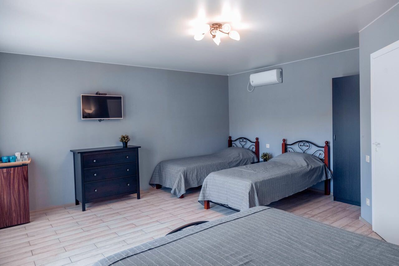 Просторный номер с двуспальной и двумя односпальными кроватями идеально подойдет для дружеской компании или большой семьи. В номере есть все необходимое для комфортного проживания: прикроватные тумбочки, вместительный шкаф, холодильник, чайник, телевизор и кондиционер.